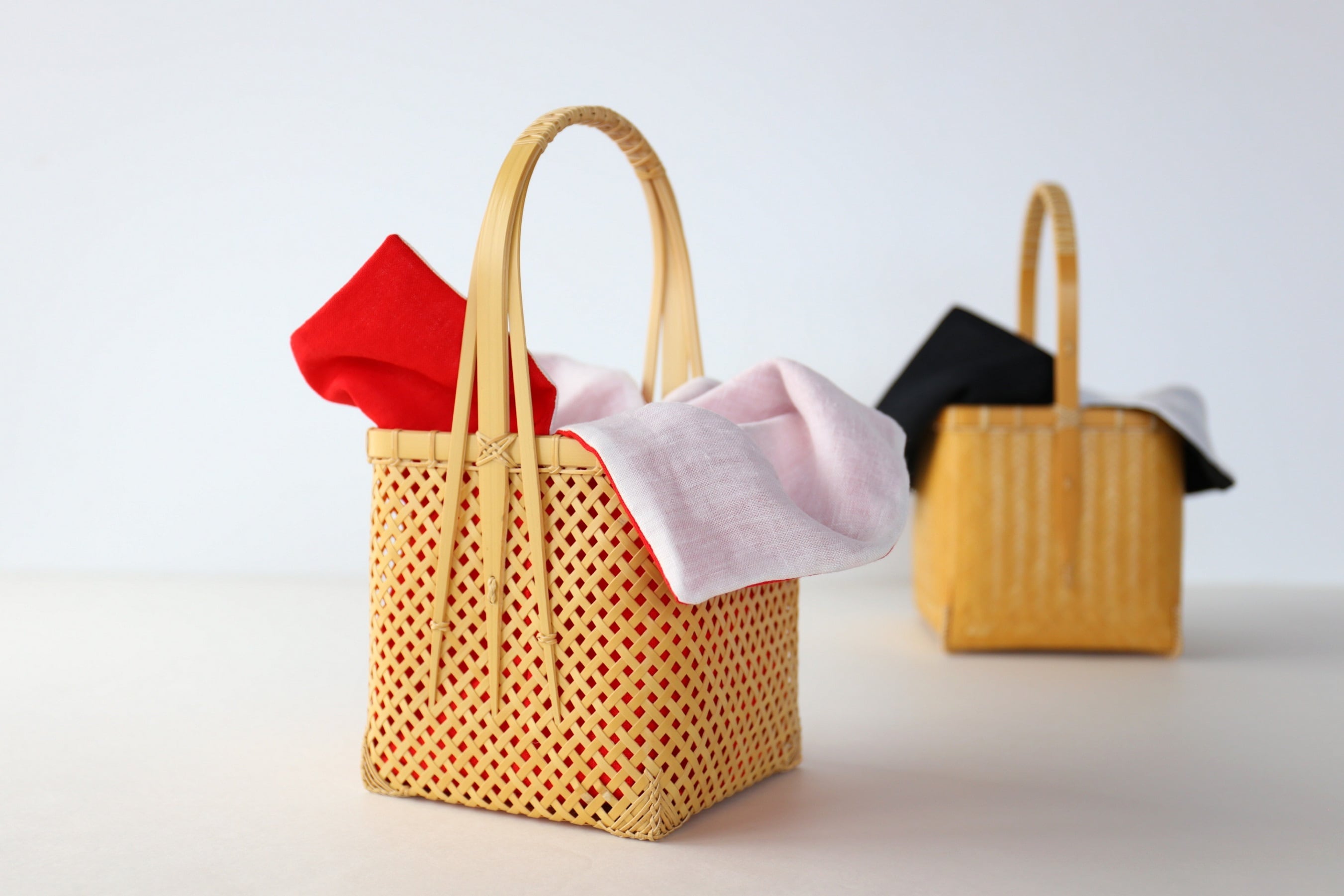 冲竹工藝舎(ちゅうたけこうげいしゃ)齊藤豊子さんによる小さな竹籠バッグ(菱四ツ目編みスクエア)が入荷しました。